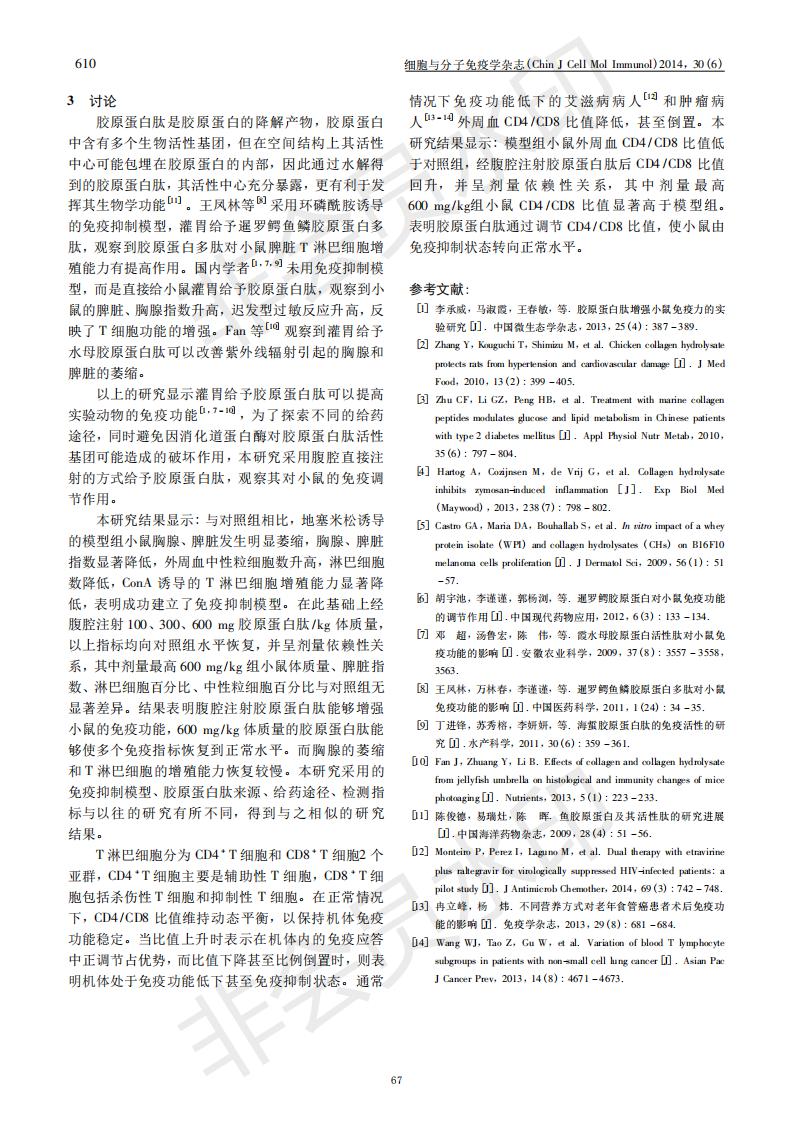 腹腔注射膠原蛋白肽增強糖皮質激素免疫抑制模型小鼠的免疫功能