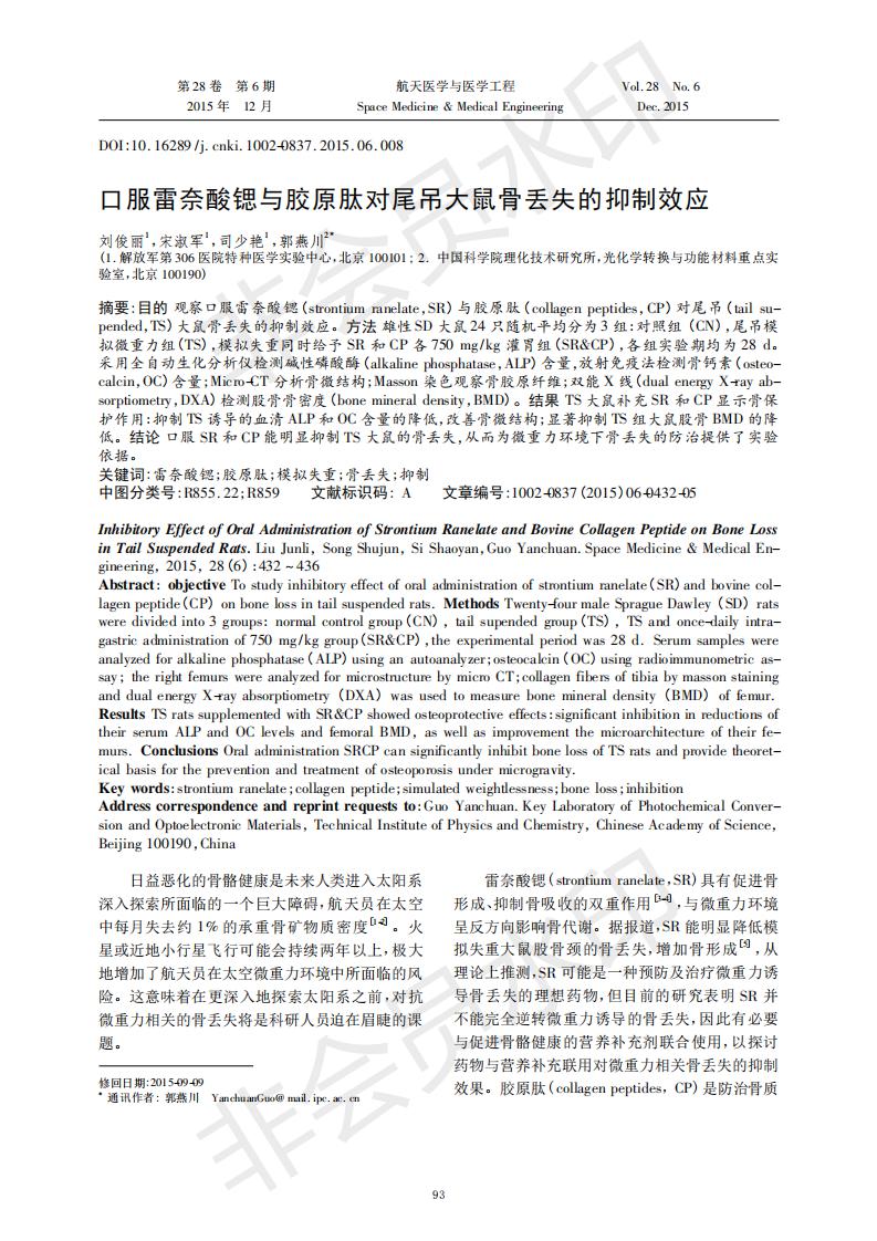 口服雷奈酸鍶與膠原肽對尾吊大鼠骨丟失的抑制效應
