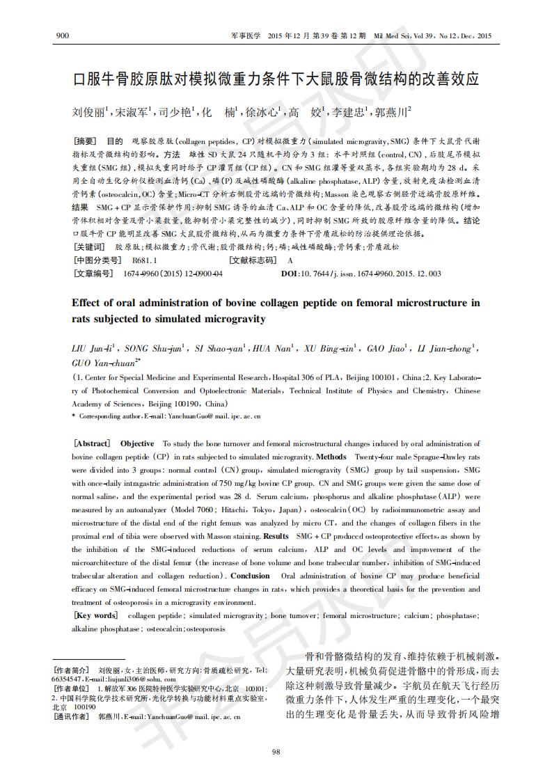 口服牛骨膠原肽對模擬微重力條件下大鼠股骨微結構的改善效應